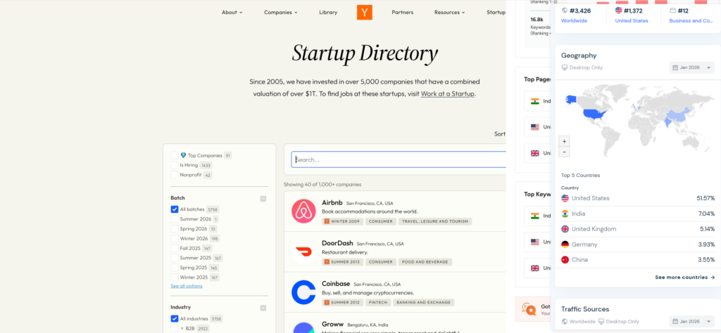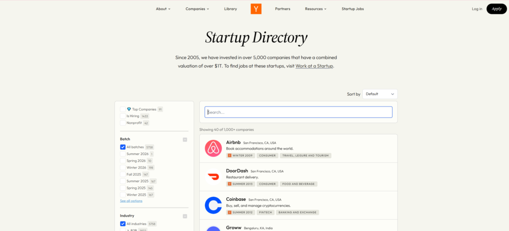 Most of the startups listed on Y Combinator are companies from the USA. You can also find startups from major countries like the UK, Germany, and China. This means there are some very serious and fast-growing startup companies here.